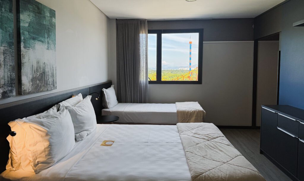 A Suíte Luxo 2 possui uma vista maravilhosa para o parque Beto Carrero, com uma banheira espaçosa é a escolha ideal para quem quer relaxar após um dia de muita agitação e divertimento. Acomoda confortavelmente até 4 pessoas.